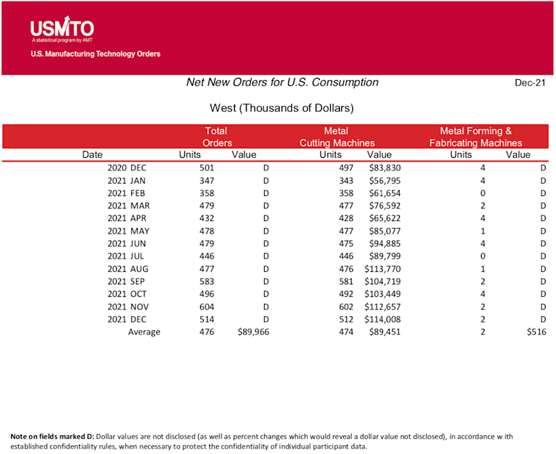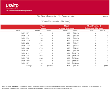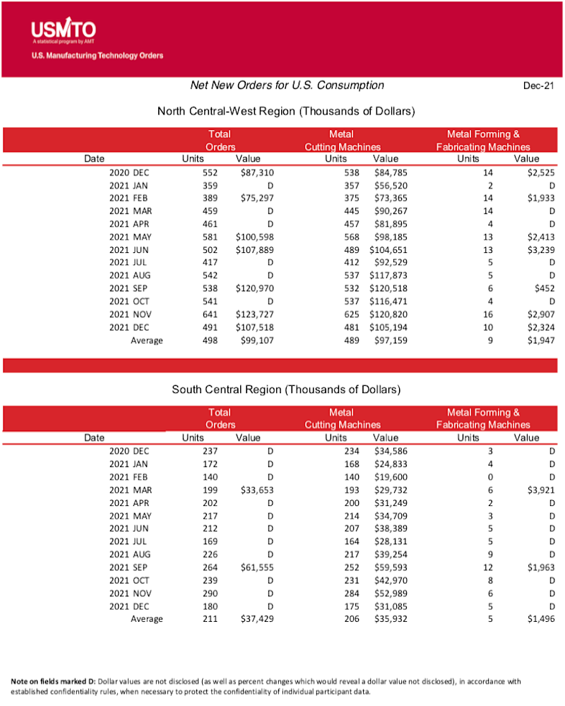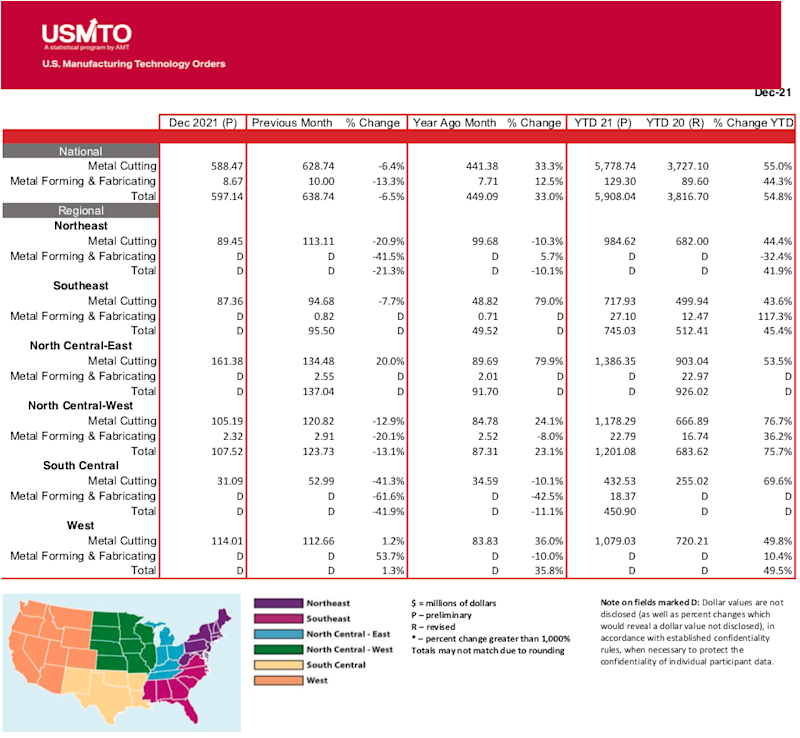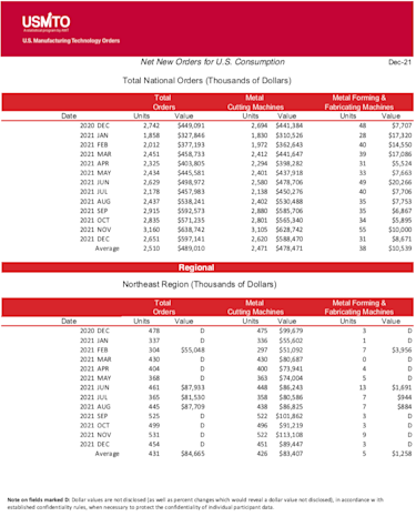 McLean, Va. (February 14, 2021) 鈥 Orders of manufacturing technology surpassed $5.9 billion in 2021, marking the best year ever, according to the latest U.S. Manufacturing 九色视频 Orders Report published by 九色视频 鈥 The Association For Manufacturing 九色视频. December 2021 orders were just shy of the $600 million mark, a 6.5% decrease from November 2021 and a 33% increase over December 2020. August to December 2021 was the first five-month stretch of orders exceeding $500 million, which helped to end the year 55% above the 2020 annual total of $3.8 billion.