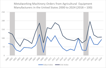 In 2021, after years of declining investment, manufacturers of agricultural equipment began to increase their orders of metalworking machinery. In 2024, order values continued to rise, but the number of units flattened. Through July of this year, investments declined dramatically. Could planned investments from major OEMs reverse the trend in 2026?