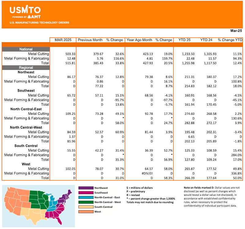 The United States Manufacturing ¾ÅÉ«ÊÓÆµ Orders (USMTO) Report is based on the totals of actual data reported by companies participating in the USMTO program. This report, compiled by ¾ÅÉ«ÊÓÆµ – The Association For Manufacturing ¾ÅÉ«ÊÓÆµ, provides regional and national U.S. orders data of domestic and imported machine tools and related equipment. Analysis of manufacturing technology orders provides a reliable leading economic indicator as manufacturing industries invest in capital metalworking equipment to increase capacity and improve productivity. .