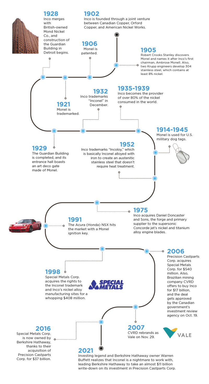 In 1905, a guy named Robert Crooks Stanley, who worked at Inco, the International Nickel Co., discovered Monel. My hypothesis is (couldn鈥檛 find any confirmation on the web, so hit me up if you know) Stanley and Inco thought it was significant enough to name after the first chairman of the company, Ambrose Monell. But back in those days, you couldn鈥檛 legally name a discovery after someone. So, they took off the last letter and called it 鈥淢onel.鈥 Then, when they developed their next big alloy, I鈥檓 assuming they combined the company name 鈥淚nco鈥 with the last part of their first significant alloy, 鈥淢onel,鈥 and bam! Inconel was born. Don鈥檛 quote me on this, though. It鈥檚 just my speculation.