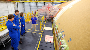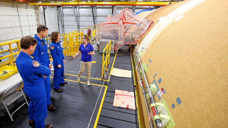 Artemis II NASA astronauts Reid Wiseman and Christina Koch of NASA and CSA (Canadian Space Agency) astronaut Jeremy Hansen view the core stage for the SLS (Space Launch System) rocket at the agency鈥檚 Michoud Assembly Facility in New Orleans.